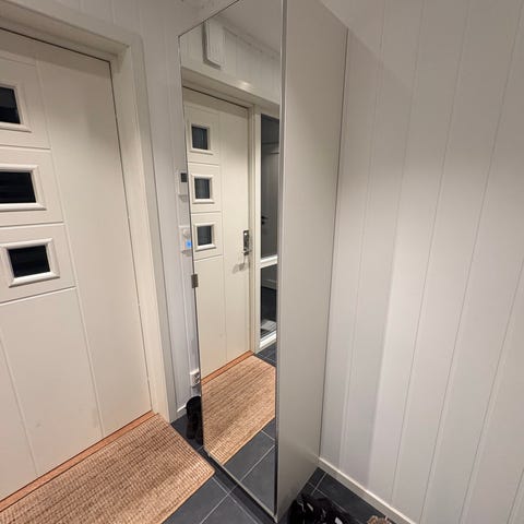 Smalt speilskap til bad i hvit utførelse. Skapet har speildør på utsiden og flere faste hyller på innsiden for oppbevaring av toalettartikler eller lignende. Egner seg for montering på vegg på bad eller vaskerom der det er behov for både speil og oppbevaringsplass i høyden. Ingen synlig merkevare eller modellbetegnelse på produktet.
