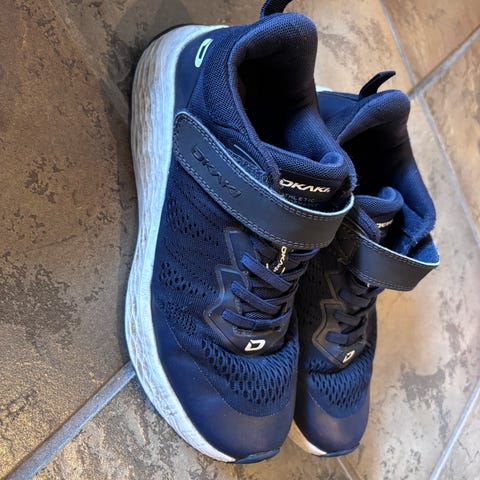Okaki joggesko/fritidsko for barn, mørkblå, str 32. Brukt noen timer på 17. mai og i et selskap inne. Vokst ut av før vi rakk å bruke de mer :-)