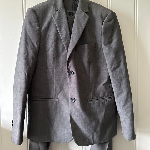 Selger en svært pent brukt grå kvalitetsdress fra Pascal i str 15/170 cm. Den består av dressjakke, vest og bukse. Fin, smal passform. Laget av 30% ull, 25% viscose og 45% polyester.