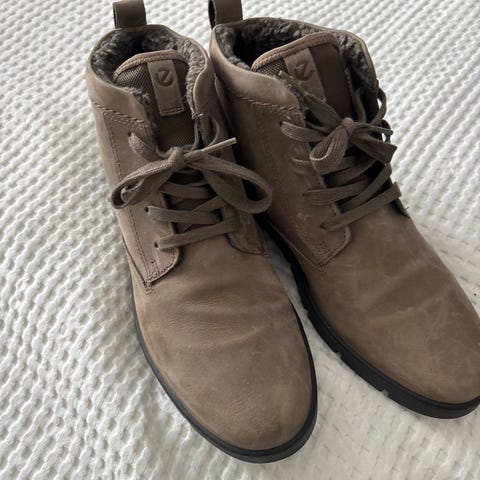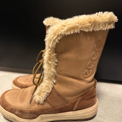 Ecco vinterstøvler i størrelse 40. Støvlene er i brun farge med lys såle og har mykt, loddent fór langs skaftet for ekstra varme. Modellen har middels høyt skaft og snøring foran for justering av passform. Yttersålen har kraftig mønster for bedre grep på glatte underlag. Passer som varme og praktiske sko til bruk i vinterhalvåret. Støvlene er minimalt brukt. Like gode som nye.