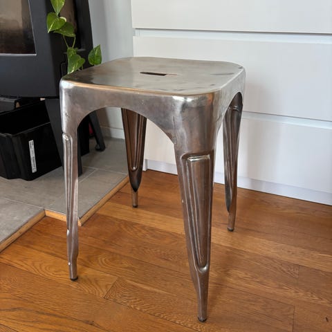 Unik metallkrakk. Høyde 46, omkrets sete 31 cm, avstand mellom bena nede 24 cm. Stødig å sitte på. Liten og nett og passer derfor mange steder. Vi har selv brukt den i en smal gang /entre