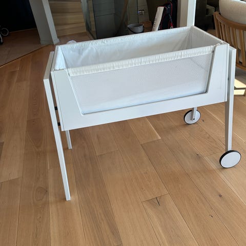Sengen er utformet som en side-by-side babyseng som kan plasseres inntil voksenseng. Den har åpning mot foreldresengen som kan senkes for enkel tilgang til barnet. Høyden kan justeres for å tilpasses ulike sengehøyder. Sengen står på ben i lyst treverk, med to faste ben og to ben med hjul for enkel forflytning i rommet.