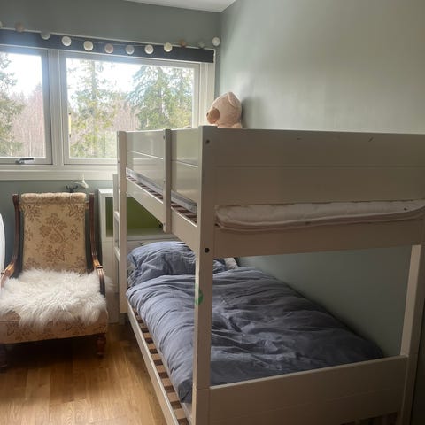 IKEA loftseng i hvit utførelse. Sengen har integrert sofa under soveplassen, med grå puter. Under sofaen er det en uttrekkbar ekstra seng med ribbebunn. Det er rett stige på siden for adkomst til øverste køye. Løsningen gir kombinasjon av soveplass og sitteplass, og passer til barnerom hvor man ønsker å utnytte plassen godt.
