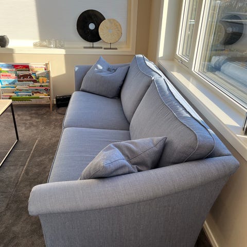 Vi selger vår Rucola 2,5-seter sofa i fargen grå. Dette er en sofa vi er svært fornøyd med da den er komfortabel, stilren og plass-effektiv! Vi opplever den også som solid og med god kvalitet. Ingen merker eller skader.