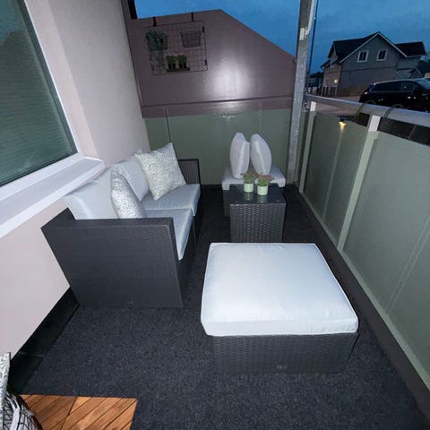 Utegruppen er i god stand. Det følger med puter til alle delene som vist på første bilde. Noe flekker på putene, men trekkene kan vaskes. De er oppbevart inne om vinteren.