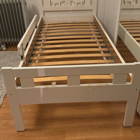 IKEA juniorseng i hvitmalt tre. Sengen har ribbebunn i tre og rekkverk på tre sider som gir støtte og kan fungere som dagseng eller barneseng. Under sengen er det plass til oppbevaringsbokser eller skuffer (løse bokser følger eventuelt med etter avtale). Passer til madrass i juniorstørrelse. Egnet til barn som har vokst ut av sprinkelseng.