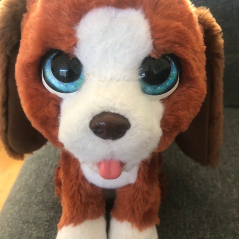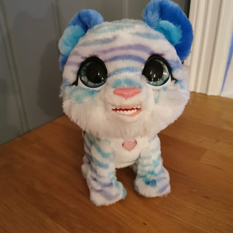 Denne søte lille leken fra Hasbro spiser mat, lager mange artige lyder, åpner munner og sleiker i seg maten. Maten kommer ut igjen i en luke på undersiden av leken. Små deler, så egner seg for litt større barn over 3 år...