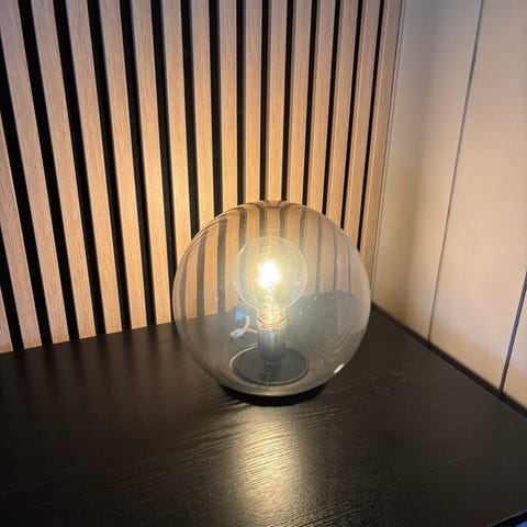 IKEA pendellampe med rund glasskuppel i røykfarget glass. Lampen har oppheng i mørk utførelse og er beregnet for montering i tak. Egnet som belysning over spisebord, i stue eller andre oppholdsrom der man ønsker direkte og dekorativ belysning.