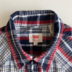 Levi's denimskjorte for herre i størrelse S. Skjorten er i lys blå denim og laget av bomull. Den har klassisk western-inspirert design med trykknapper i front, to brystlommer med klaff og knapp, samt mansjetter med knappelukking. Passer som fritidsskjorte eller som lett ytterlag over T-skjorte. Basert på merkelappen er dette en original Levi Strauss & Co-skjorte i jeansstoff.