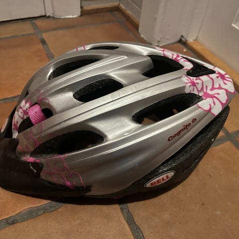 Uvex sykkelhjelm i størrelse S/M. Hjelmen har rød og flerfarget overflate med flere ventilasjonsåpninger. Justerbar stropp under haken. Godkjenningsmerker og CE-merking på innsiden.