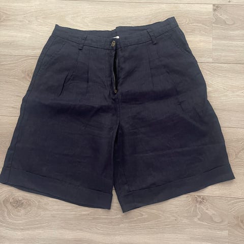Bitte Kai Rand shorts for dame i størrelse 42. Shortsen er svart og laget av 100 % lin. Den har knapp og glidelås foran, elastikk i linningen bak og stikklommer i sidene. Nederst på bena er det en liten splitt.