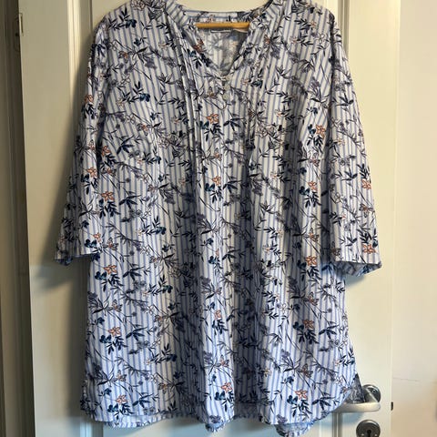 .En bluse er flerfarget med mønster, har lange ermer med lett rynking ved mansjettene og løs passform. V-utringning foran og lett innsvingt liv som gir en ledig og komfortabel silhuett.En er lys beige og sort mønstrete og en hvit med blonder. Egner seg til hverdagsbruk og kan kombineres med både bukser og skjørt. Se pris under bilde.