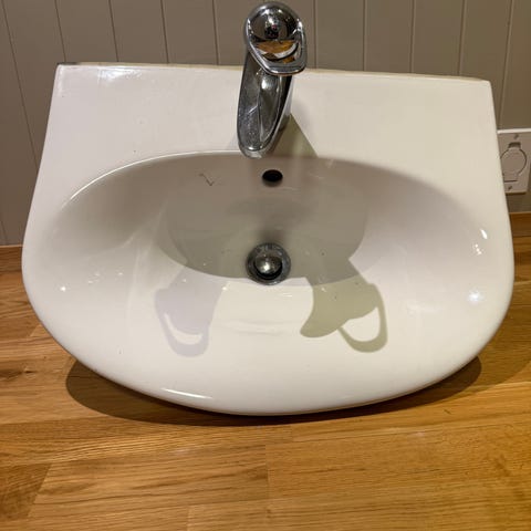 Hvit servant med rektangulær kum og integrert overløp. Leveres med kromfarget blandebatteri og tilkoblingsslanger.