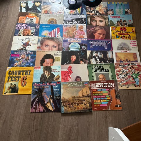 Samling med LP-plater fra ulike artister. Bildene viser flere kjente navn innen pop, country, gospel og vise, blant annet Dusty Springfield, Svend-Erik Fjeldberg, Kim Carnes, Eddie Skoller, Randi Hansen, Ray Conniff, Julio Iglesias, Mahalia Jackson, Connie Francis Wenche Myhre, Stevie Wonder og andre. Platene er standard 12" vinyl-LP-er med originale cover. Egner seg for deg som ønsker en variert samling med musikk fra ulike tiår og sjangre. Antall plater og eksakte titler fremgår delvis av bildene.
