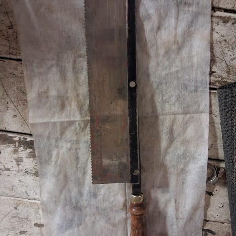 Sammenleggbar lommekniv i metall med perlemor-lignende skjefte. Kniven har et smalt, rett blad og en total lengde på omtrent 16 cm utfelt, og rundt 9 cm sammenlagt (se målebånd på bildene for nøyaktige mål). Utstyrt med lite kulekjede i enden for feste til nøkkelknippe eller lignende. Egnet som enkel brukskniv til hverdagsoppgaver der en kompakt lommekniv er praktisk.