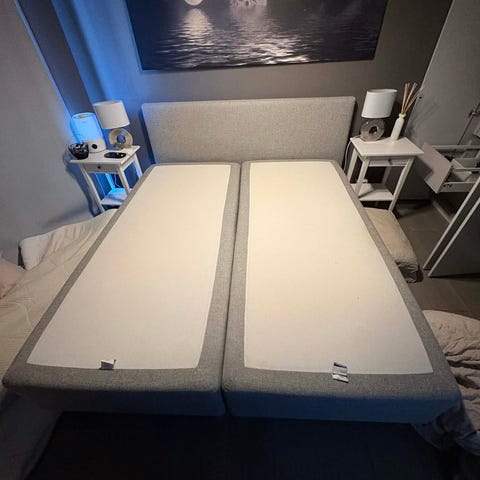 Det kan følge med sengegavl og ekstra høye ben til sengen(fint til robotstøvsuger, sånn at den kommer seg under sengen) for noe ekstra, ikke samme merke som sengen.