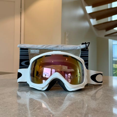 Oakley skibriller med blått speilglass og svart, justerbar stropp med Oakley-logo. Brillene har stor, buet linse som gir bredt synsfelt. Leveres med myk oppbevaringspose fra Oakley som kan brukes til å beskytte og rengjøre linsen. Passer til alpint, snowboard og annen vintersport.
