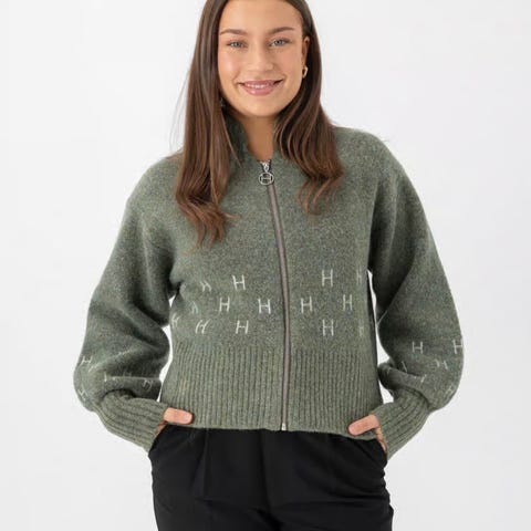 HÉST (Heest) strikkejakke med glidelås, høye ribber på ermene og nederst, og elegante H-logoer strikket inn i designet. Laget av en behagelig blanding av 30% ull, 15% alpakka, 30% akryl, 22% nylon og 3% elastan. Denne jakken gir både stil og komfort.