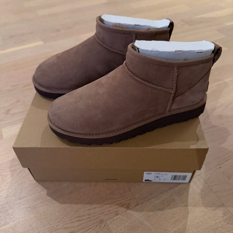 UGG vinterstøvler i størrelse 36. Modellen er ankelhøy med semsket overdel i grå tone og mykt, fôret innvendig materiale. Sålen er kraftig med mønster for bedre grep på glatt underlag. Passer til hverdagsbruk i kaldt vær.