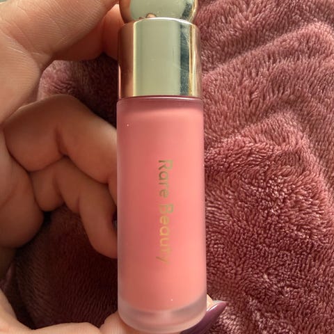 Rare Beauty Grace blush i flytende kremform, rosa nyanse. Produktet kommer i en matt glassflaske med gullfarget kork. Innholdet er 7,5 ml (0,25 fl oz). Blushen er beregnet for bruk i ansiktet for å gi farge til kinnene. Passer til generell sminkebruk. Brukt men mye igjen