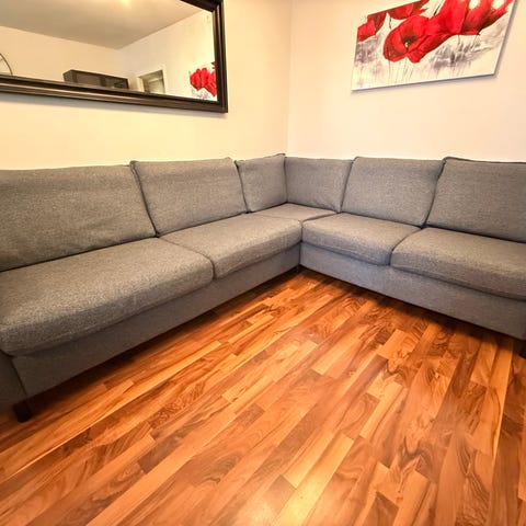Formfin sofa i grått tekstiltrekk. Sittedybde 50 cm.