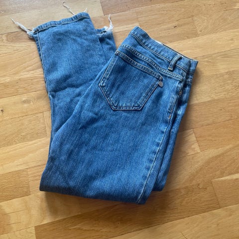 Buksen er i lys blå denim og laget av bomull. Klassisk 5-lommers modell med beltehemper, glidelås og knapp i front.
