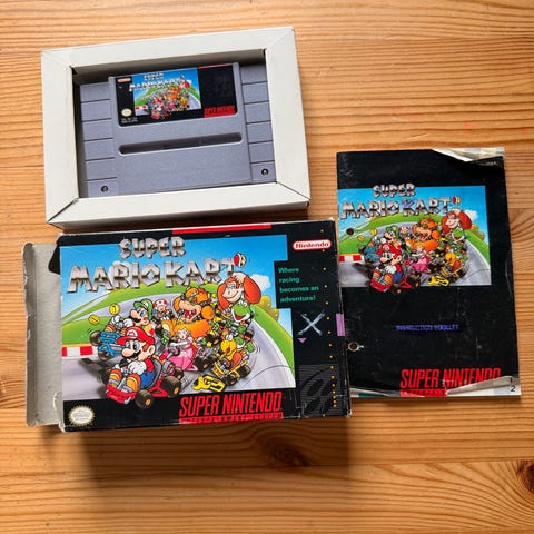 Nintendo Super Metroid spillkassett til Super Nintendo. Original SNES-kassett med etikett foran og standard grå plastbakside. Spillet er et action/eventyrspill der spilleren styrer figuren Samus Aran gjennom ulike områder med plattform- og utforskningselementer. Passer til konsoller som er kompatible med Super Nintendo-spill i tilsvarende region. Kassett vises i bruk på bilder med spillsekvenser på skjerm.