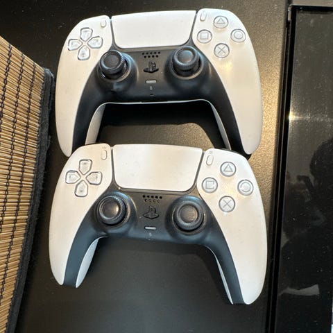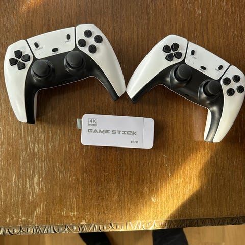 Game Stick spillkonsoll med to trådløse kontrollere i hvit og svart. Konsollen kobles til TV via HDMI og får strøm via USB-kabel. Settet består av selve Game Stick-enheten, en USB-strømkabel og to håndkontrollere med analoge spaker og knapper. Egnet for tilkobling til TV eller skjerm med HDMI-inngang for enkel spilling hjemme.