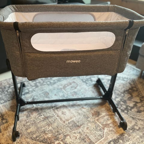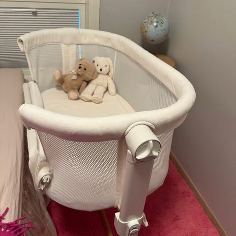 En liten og nett bedside crib som er helt super de første mnd. Sengen kan justeres i ulike høyder og den kan trilles på hjul og har god lufting gjennom nettingen. Siden åpnes med glidelås som gjør at du enkelt kan justere åpningennn
