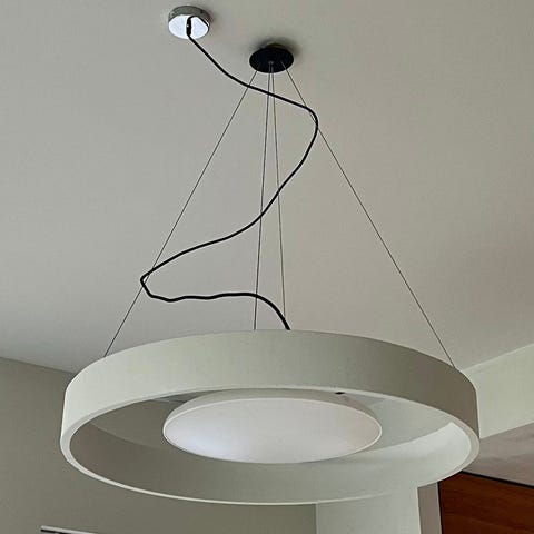 Dimbar lampe. Rund. Diameter ca 50 cm. Svart metall, frostet hvitt glass