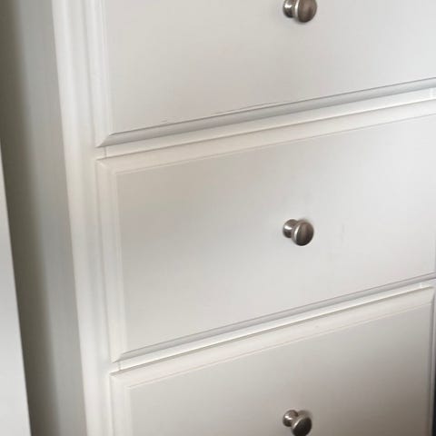 Selger en romslig hvit kommode med flere brede skuffer