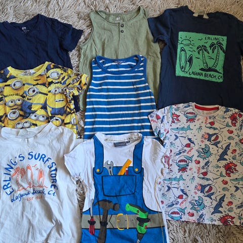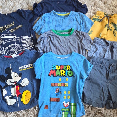 Pakke med sommerklær str. 98/104. Shorts og T-skjorter (bl.a. med Mikke Mus og dinosaur).