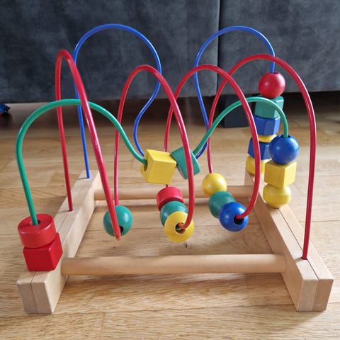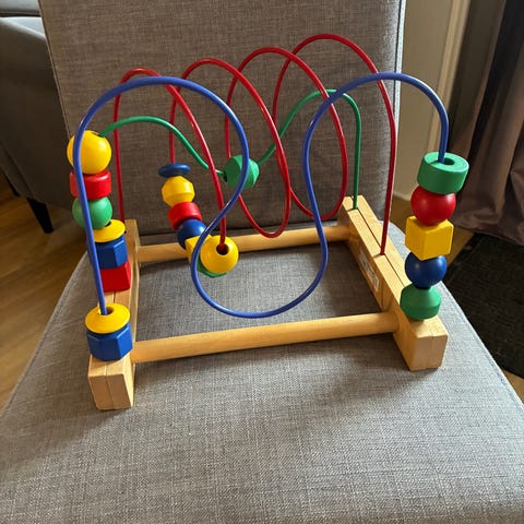 Aktivitetsleke med treperler på fargede metallbøyler. Basen er i tre, og perlene er i flere farger. Leken kan brukes av små barn til å øve hånd-øye-koordinasjon og finmotorikk ved å flytte perlene langs buene. Egnet som bordleke eller gulvleke for barn i tidlig alder.