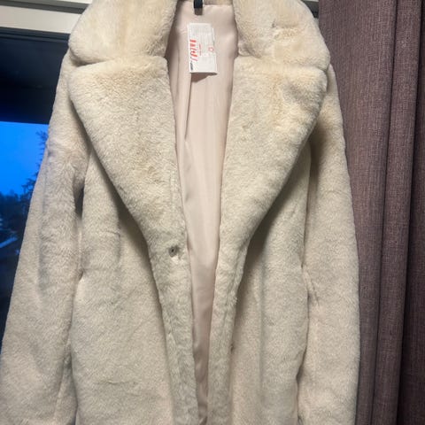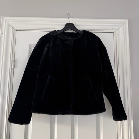 H&M jakke i fuskepels for dame i størrelse S. Jakken er svart og har myk, pelset overflate med horisontale felter. Den har hel lengde ermer og lukkes foran (lukking ikke tydelig på bildene). Innsiden er glattfôret for økt komfort. Passer som ytterjakke i overgangssesonger eller til bruk ved anledninger der man ønsker en varm og myk jakke i fuskepels. Lite brukt til pent