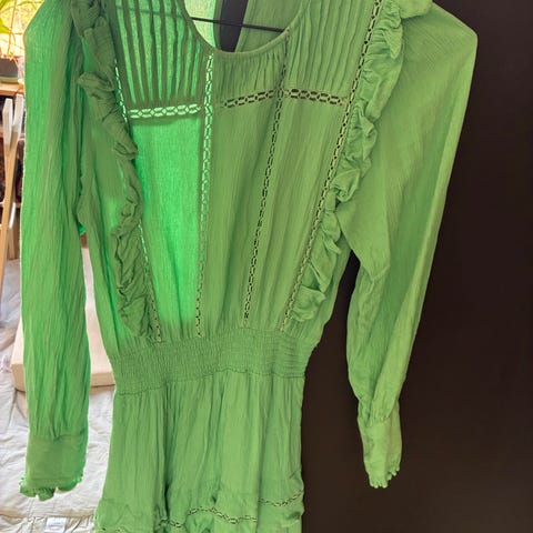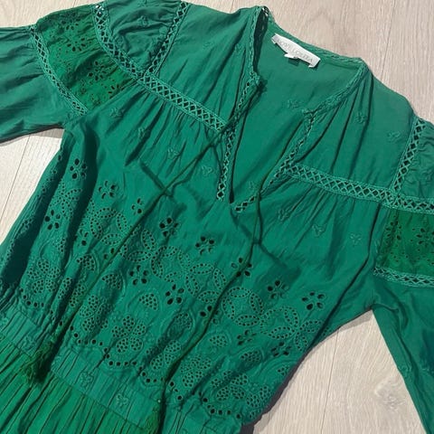 Floyd hverdagskjole for dame i størrelseS. Kjolen er grønn og laget i bomull. Modellen har lange ermer, v-utringning og dekorative blondedetaljer foran og rundt livet samt nederst på skjørtet. Lukkes med små knapper i front. Passer som hverdagskjole eller til enkle anledninger.bruker bare en gang.