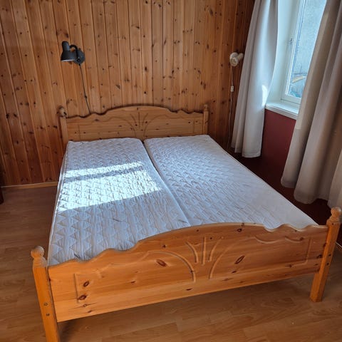 Solid seng i furu. Noe slitt men fortsatt brukbar.