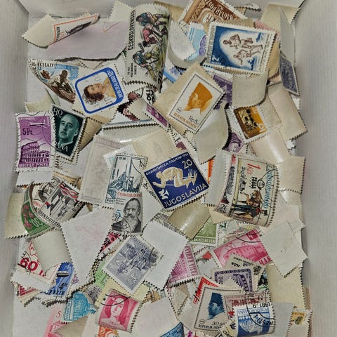 Plast pose med brukte frimerker.