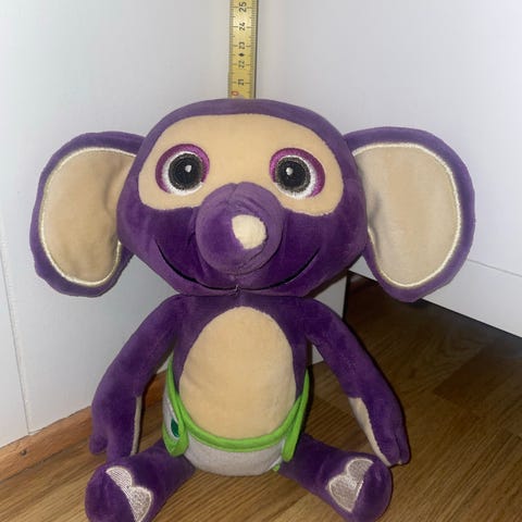 Fantorangen kosedyr i lilla og beige myk plysj. Figuren forestiller Fantorangen-elefanten fra barne-TV. Passer som kosebamse og lekekamerat for barn. Lett å holde for små hender og kan brukes både til lek og som pyntegjenstand på barnerommet.