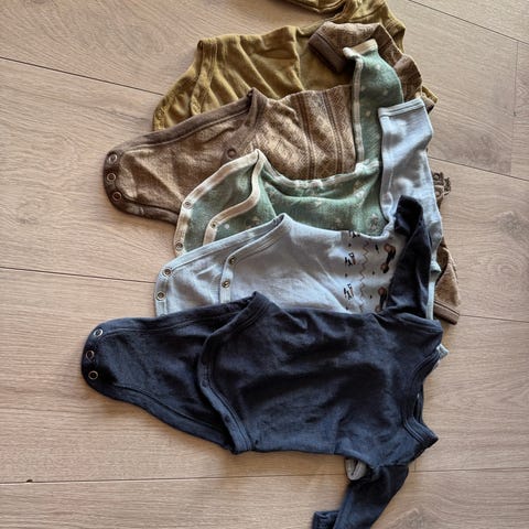 Rosa og gul body er i str 50, mens de to grønne er i str 50/56.