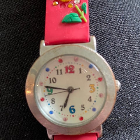 Klokke til barn kjøpt hos urmaker/gullsmedbutikk. 50 m vannavstøtende og rustfritt stål står det på baksiden.