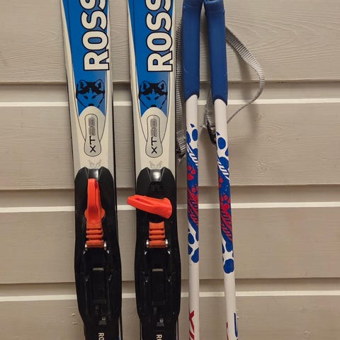 Hamax barneski med staver i hvit farge. Skiene har integrerte reimer/bindinger som festes rundt skoene, og er egnet for små barn som skal prøve ski for første gang. Settet består av to korte ski med glatt underside og to enkle staver i plast/metall med runde trinser. Passer til lek og enkel skigåing på flatt eller lett kupert underlag. Fra xxl, brukt en gang. Veldig enkle og fine å bruke.