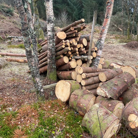Blandet ved og kvist. Blanding av kappede vedkubber, mindre vedstykker og greiner i ulike lengder og diametre. Ligger lagret utendørs.