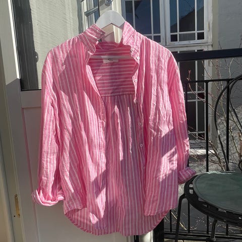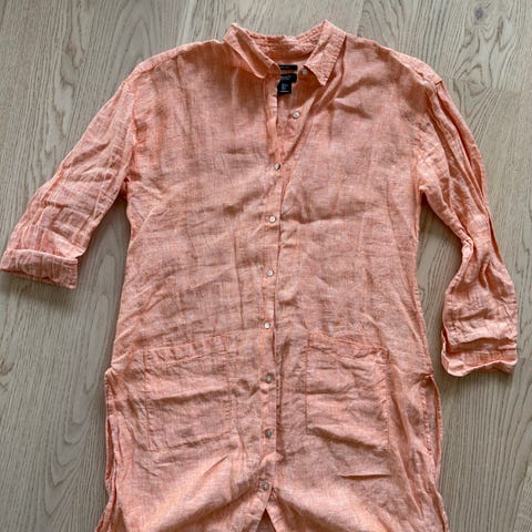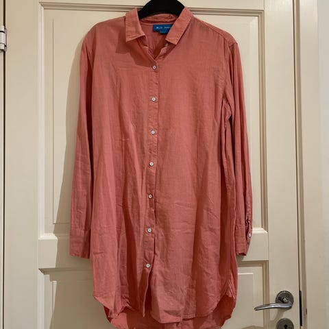 Tara Jarmon lang skjorte for dame i størrelse 36. Skjorten er rosa og laget av 100 % lin. Modellen har krage, knappelukking foran og er noe lengre i fasongen, med ermer som går omtrent til under albuen. Passer som lett overdel til hverdagsbruk eller over annet tøy i varmere vær.