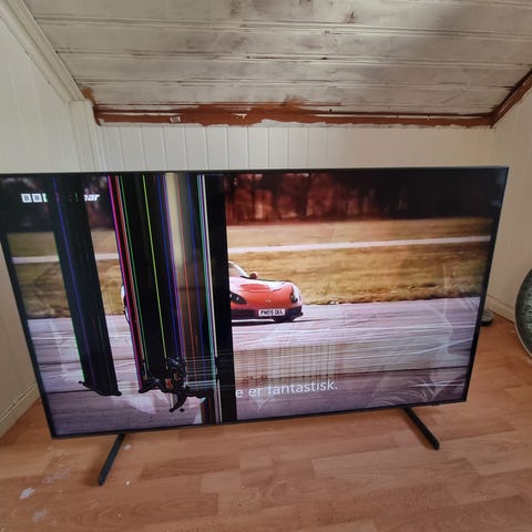 TV-en ble skadet under transport. Skjermen har synlig sprekk (se bilder), men den får strøm og baklys fungerer. Selges derfor som reparasjonsobjekt / delevare.