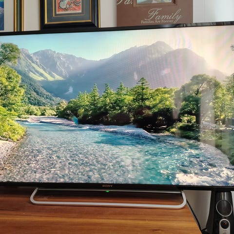 TV-en har fortsatt beskyttelsesplast på rammen.