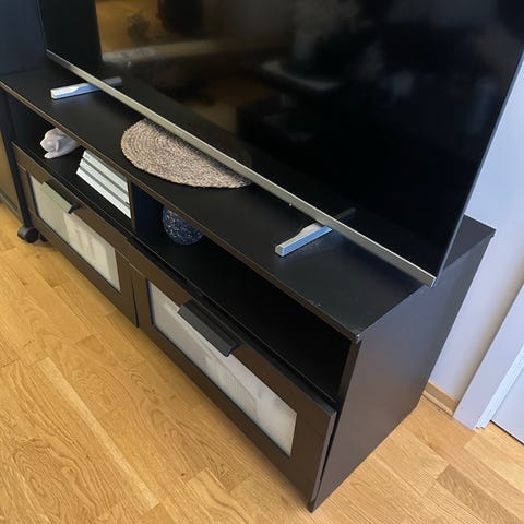 Pent brukt tvbord med glass overflate og glasskuffer gis bort. Må hentes. Glassflatene er i mørkt sort. Kjøpt på Møbelringen for noen år siden. Må hentes