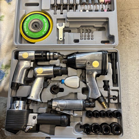 Sett med flere luftdrevne verktøy, inkludert blant annet muttertrekker, bor-/skrumaskin og meiselverktøy. Leveres i formstøpt plastkoffert med plass til verktøy og tilbehør. Kofferten er blå med bærehåndtak.