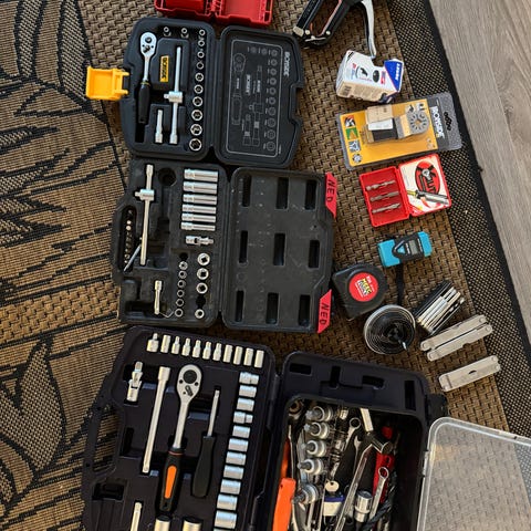 Biltema trykkluft verktøysett i koffert i blå plast.