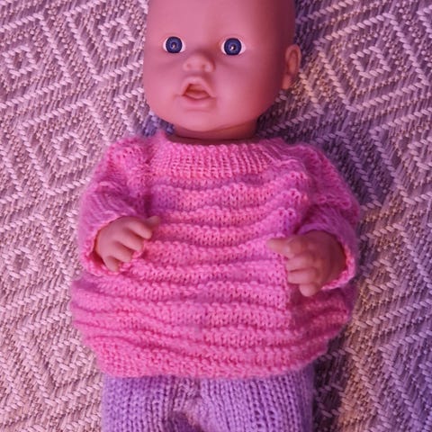 Dukke med smokk og tilhørende bærestol i rosa fargetoner. Dukken har på seg en mønstret kjole med lange ermer. Bærestolen har håndtak og polstret trekk med hjerte- og stjernemønster i rosa og lilla. Passer til lek med dukker og rollelek for barn.