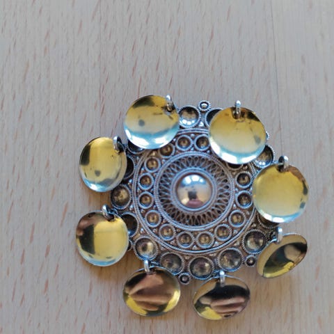 Nesten identisk med denne: https://www.sylvsmidja.no/kategoriar/bunadsolv/soljer/filigransoljer-rosesoljer/produkt/199101-soelje-oksidert-m-16mm-traadkantlauv (Pris 5.580,-)